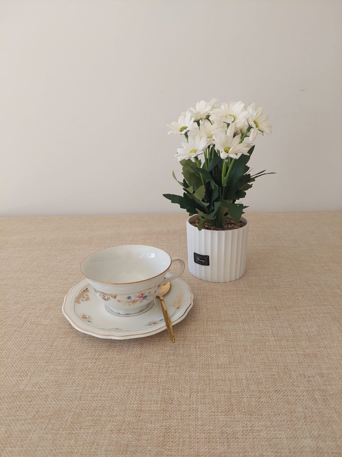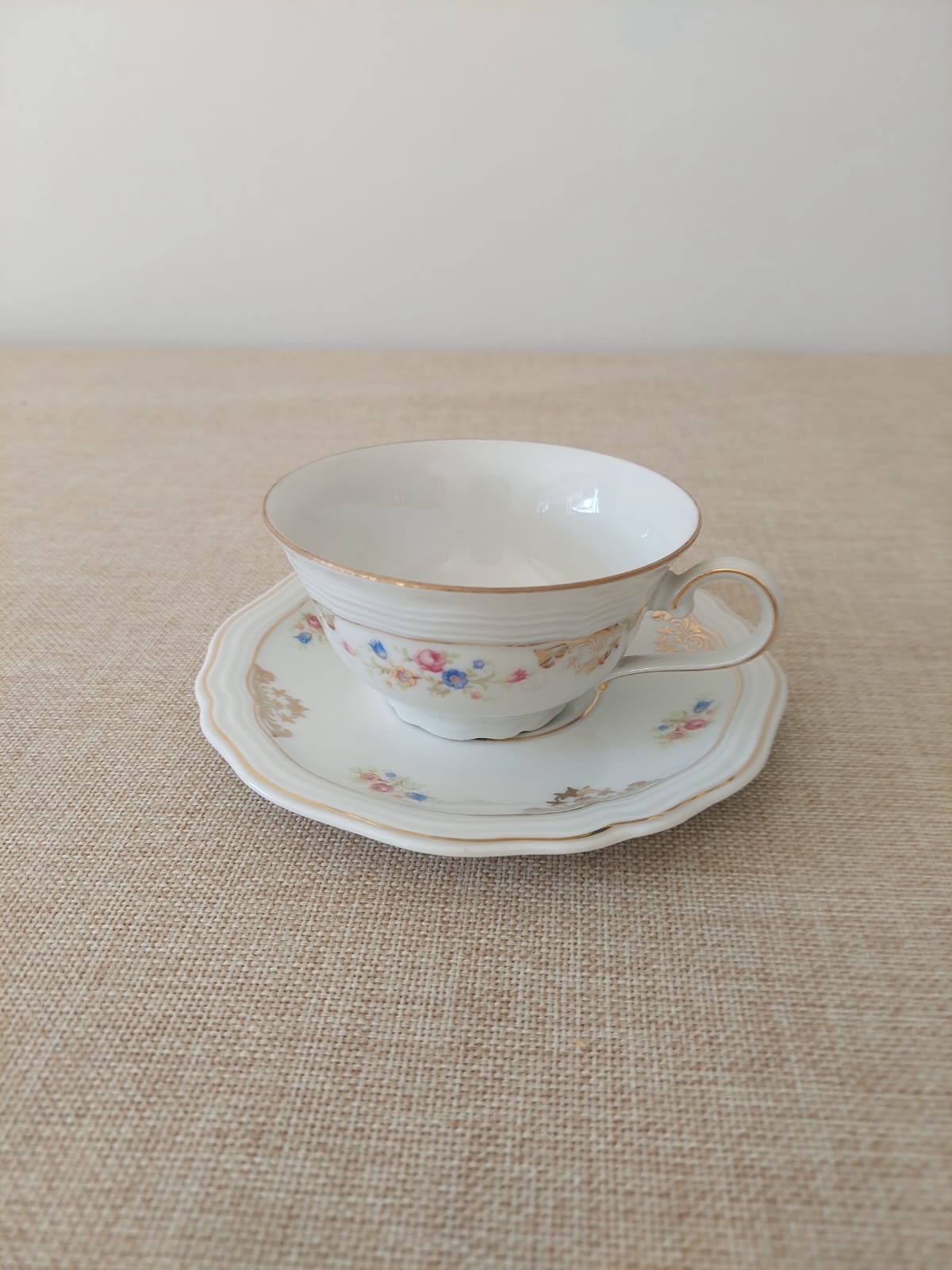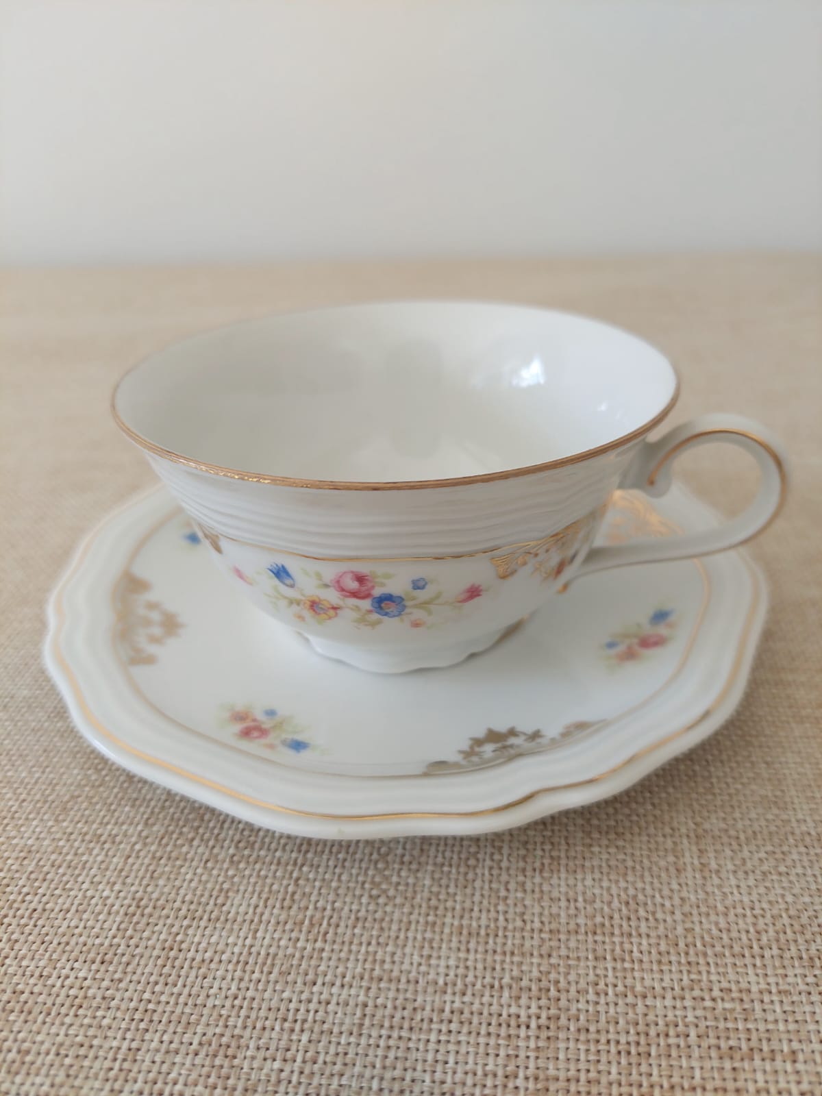 Dúo de taza y plato de té Rheinkrone Bavaria en porcelana fina blanca, con flores delicadas en tonos pastel y acentos dorados. Pieza única de colección, ideal para mesas románticas y amantes de la vajilla alemana vintage.