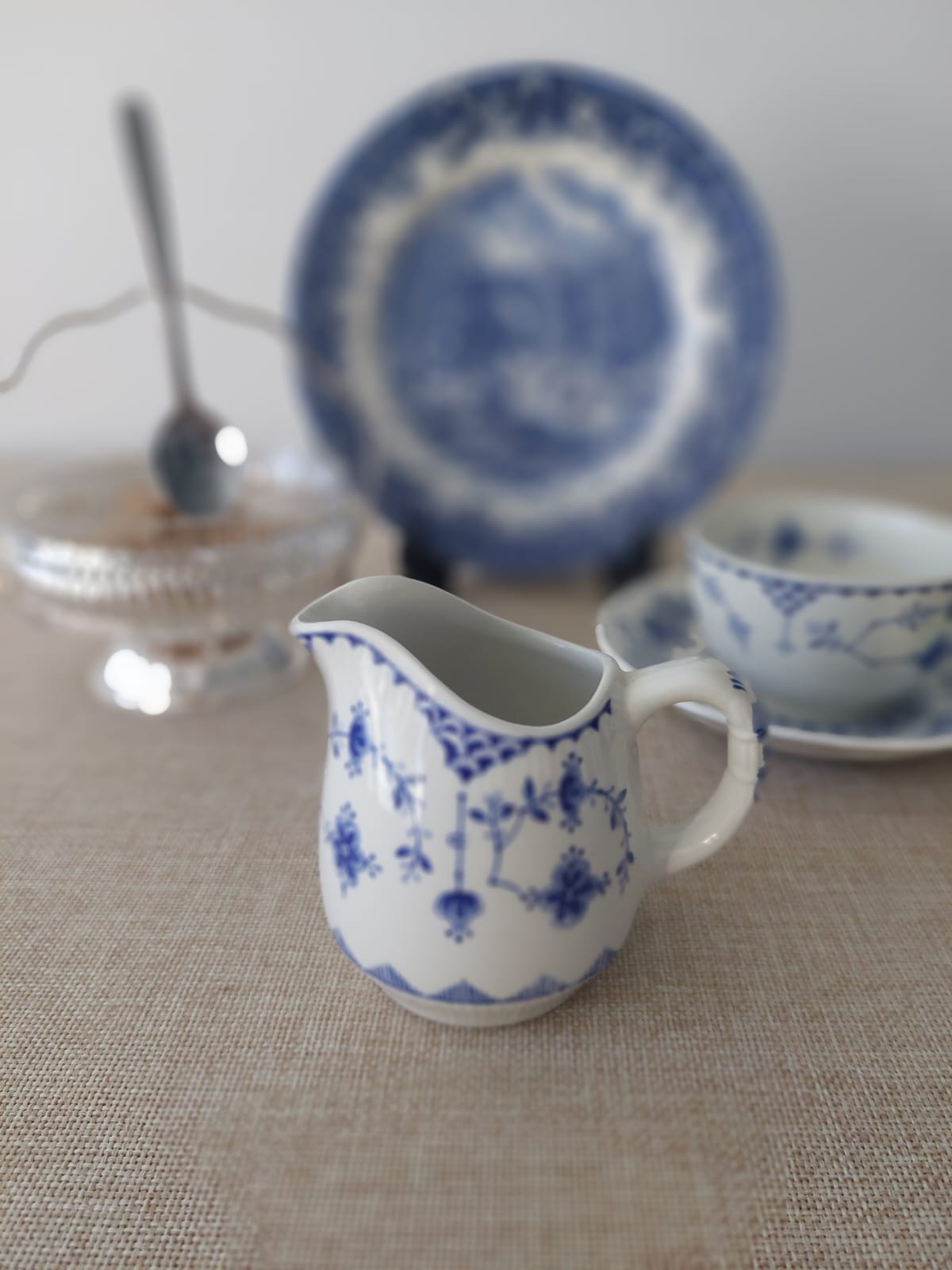 Conjunto azul y blanco armado a partir de varias casas inglesas clásicas, cada una con su propio sello dentro de la tradición cerámica británica. Furnivals fue una firma tradicional de loza inglesa conocida por sus patrones en azul para uso diario de mesa; Johnson Brothers, fundada en 1883 en Stoke-on-Trent, se hizo muy popular por sus decoraciones transferware y motivos florales en azul cobalto; Churchill es un nombre habitual en la mesa inglesa asociado a escenas campestres e invernales en azul; y Blue Heritage retoma ese lenguaje clásico con cenefas y escenas en azul intenso típicas del imaginario inglés. El conjunto se completa con el terronero Mayell, pieza con estructura calada en metal plateado y bowl de cristal tallado, muy representativa de la mesa formal británica de mediados del siglo XX. Una pequeña selección curada de marcas inglesas en paleta azul y blanco, perfecta para quienes disfrutan el mix & match con sentido histórico y estético.