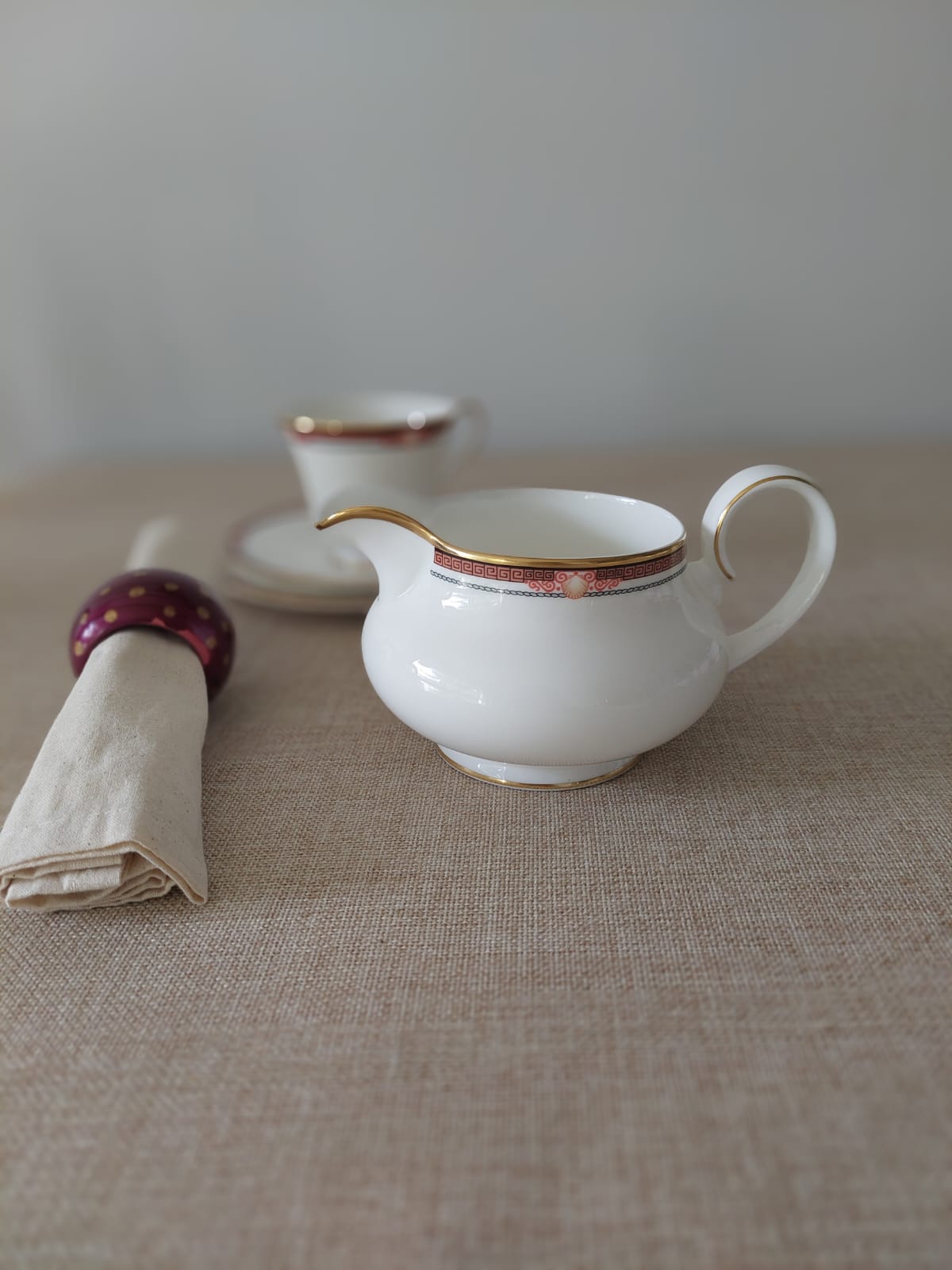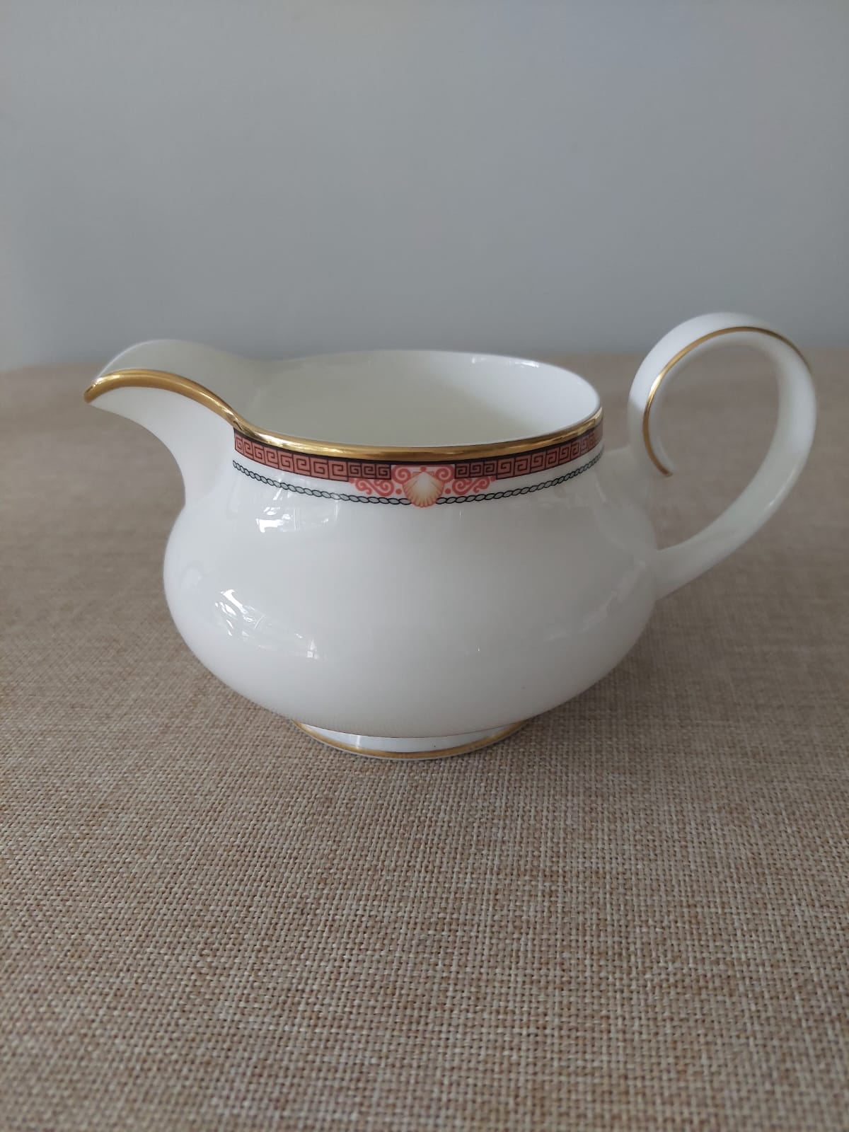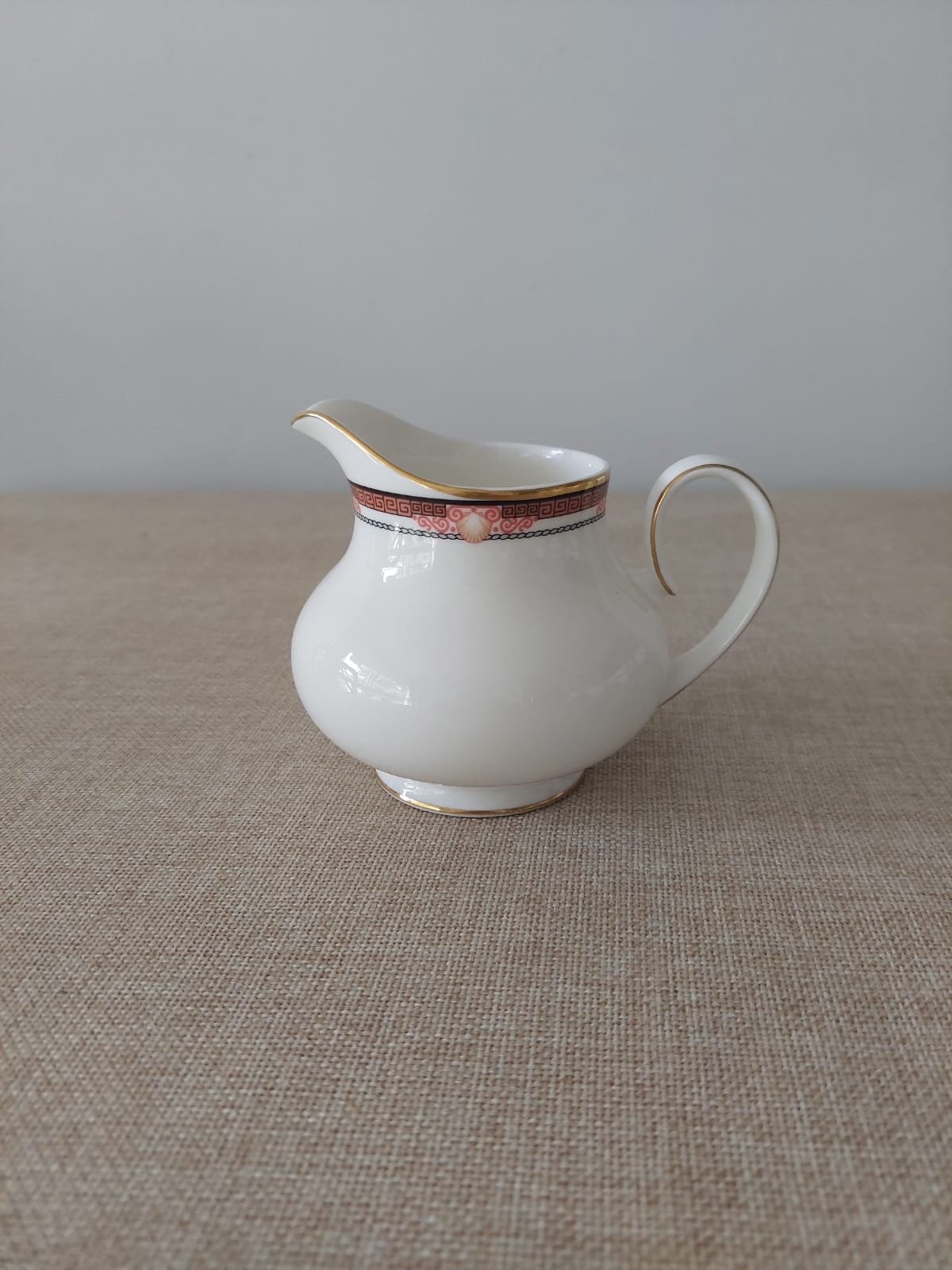 Elegante salsero en Paragon Fine Bone China, colección Delphi exclusiva para Debenhams, fabricado en Inglaterra en 1987. Fondo blanco puro con banda burdeo decorada con venera marina, greca neoclásica en negro y cadena gris, filete dorado en borde y base. Forma alargada y generosa con vertedor amplio y asa elegante. Estado nuevo, sin uso. Pieza ideal para complementar el set de té Delphi VV-006.