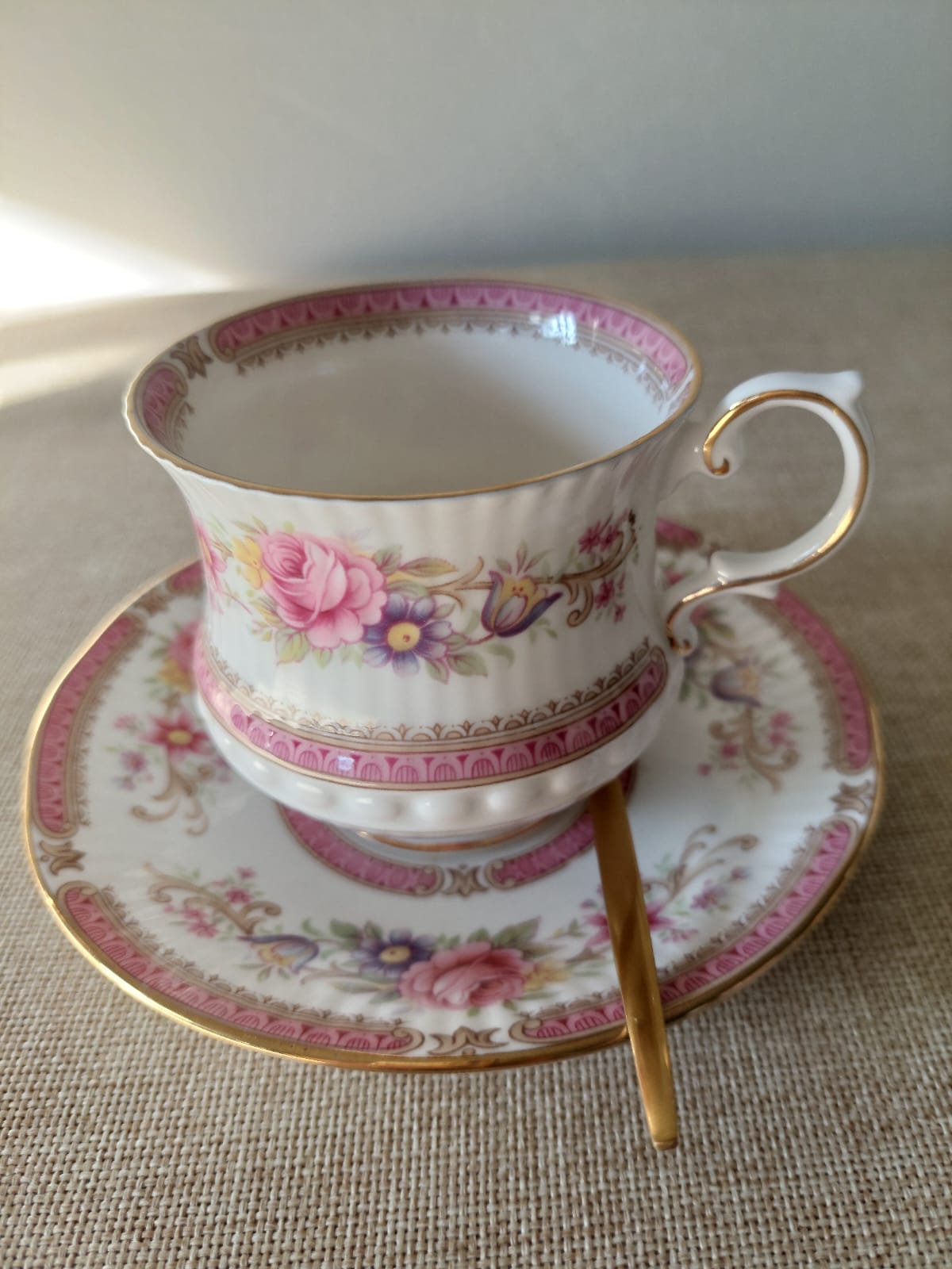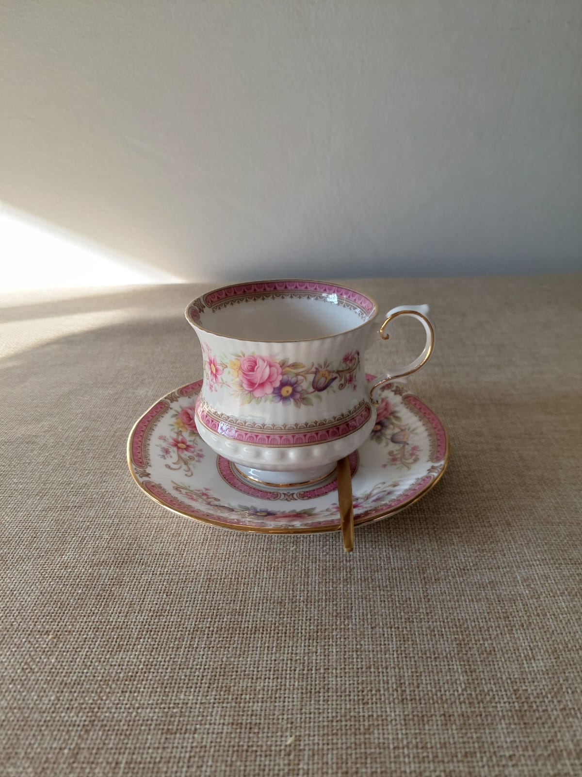 Las tazas presentan un cuerpo acanalado en relieve, con ramos de rosas en tonos rosas y flores violetas y amarillas sobre fondo blanco puro. Las bandas rosas en el borde superior e inferior, decoradas con finos arabescos dorados, enmarcan la decoración con una elegancia típicamente británica. El asa dorada completa una pieza de gran presencia.