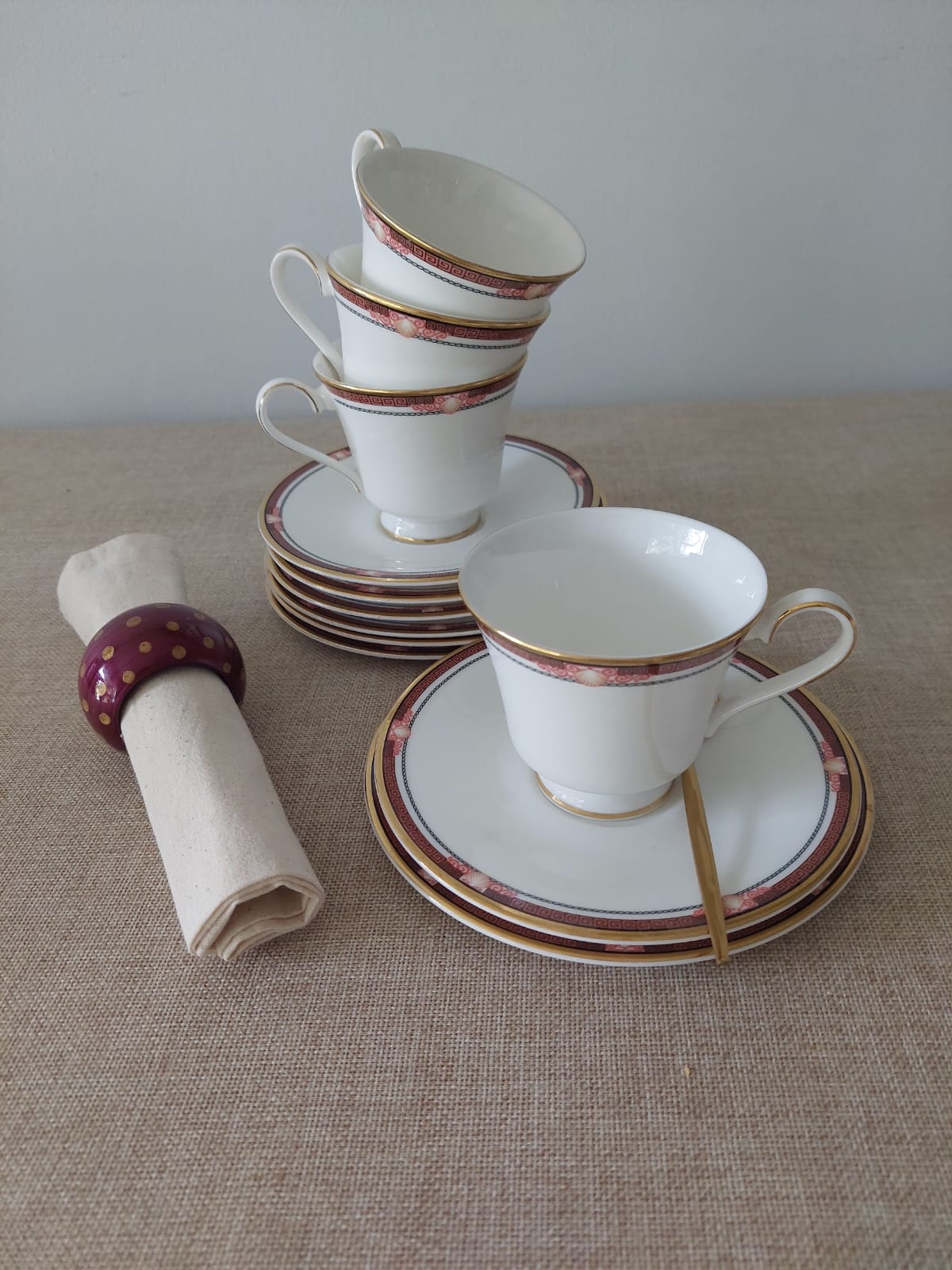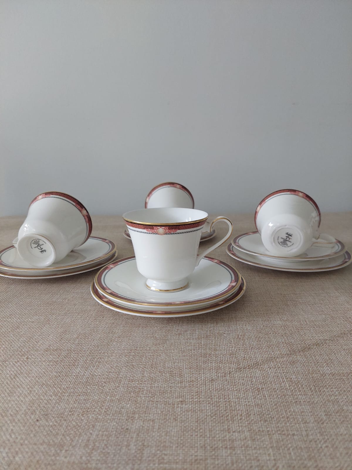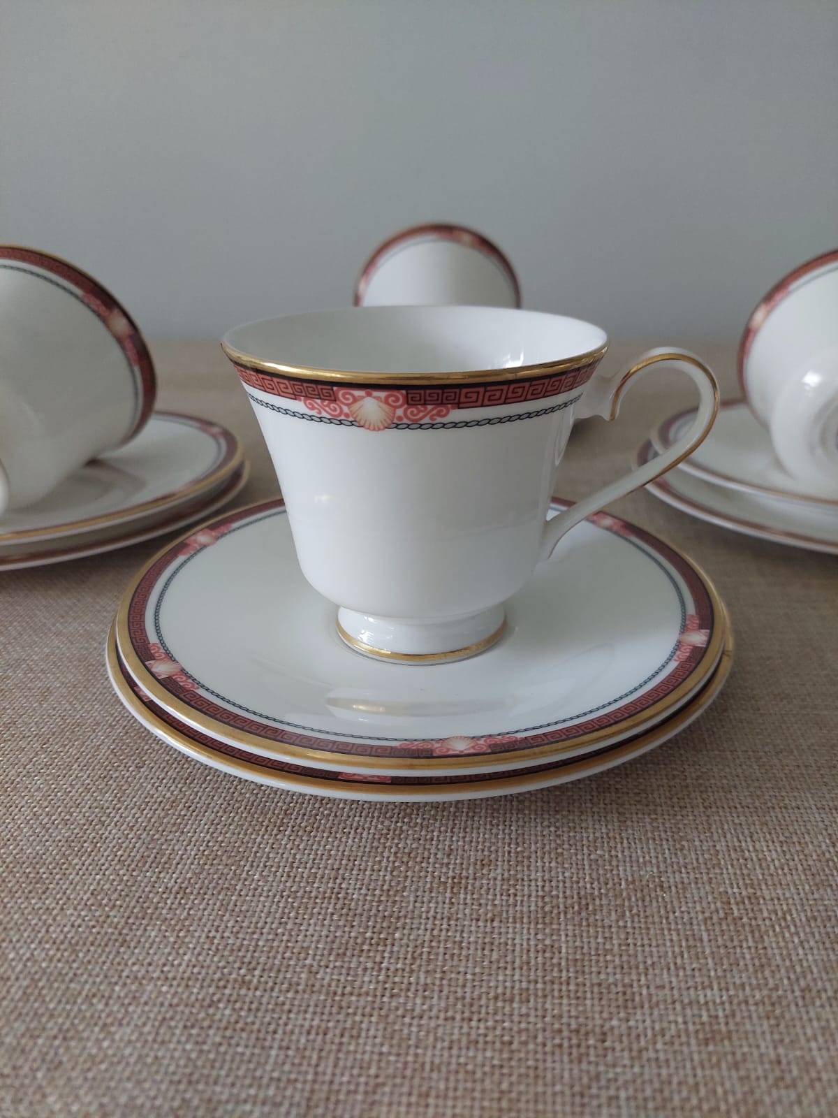 Soberbio set de 4 tríos de té en Paragon Fine Bone China, colección Delphi exclusiva para Debenhams, fabricado en Inglaterra en 1987, miembro del Royal Doulton Group. Tazas cónicas con elegante banda burdeo y motivo de venera marina con greca neoclásica y cadena en gris, filete dorado. Incluye taza, platillo y plato de torta por cada trío (3 tríos completos + 1 taza  sin su base). Estado nuevo, sin uso.