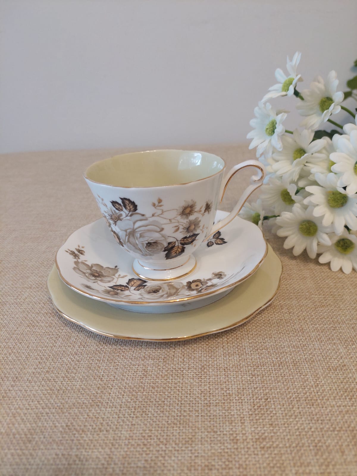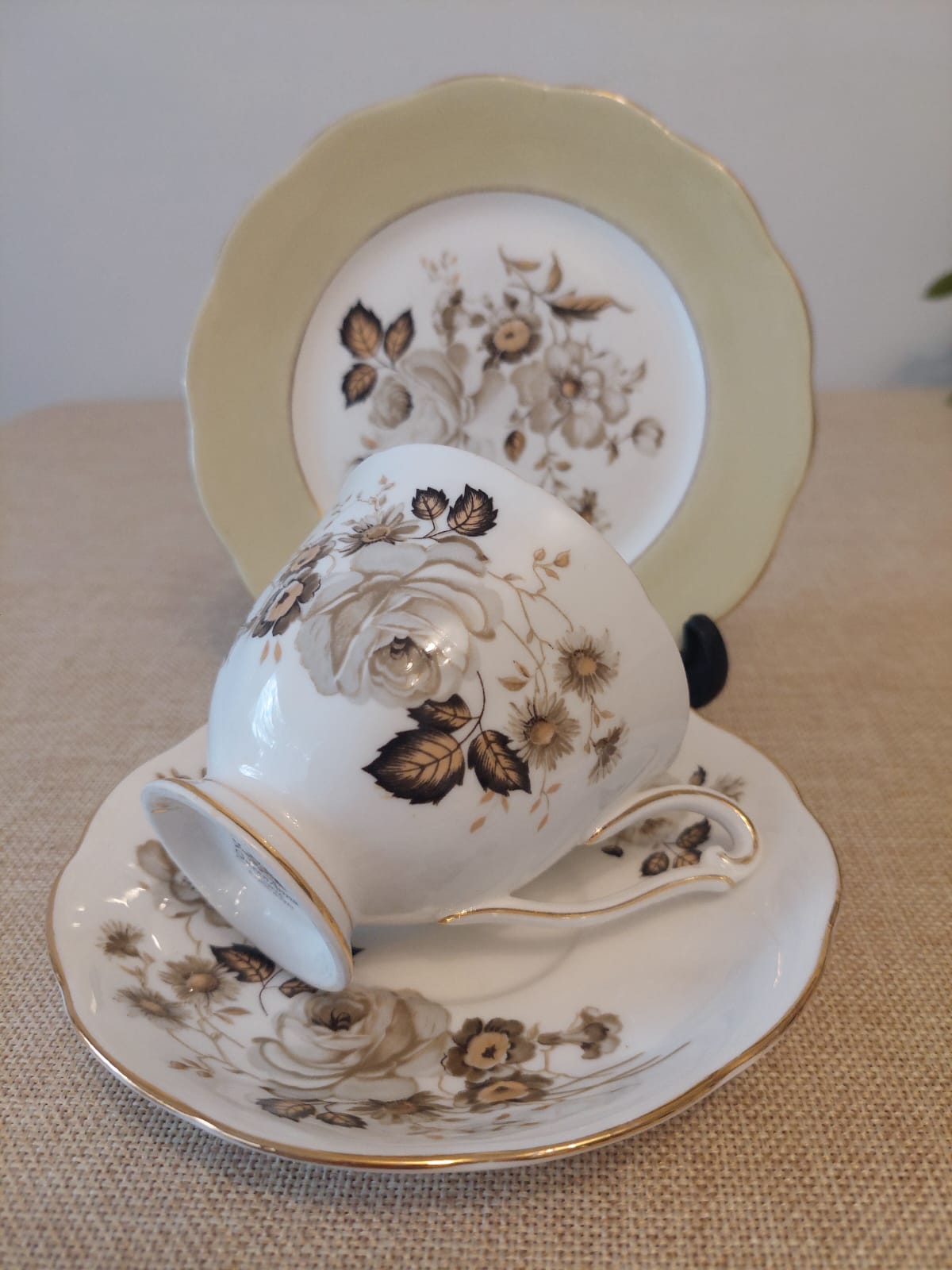 Trío de porcelana Queen Anne con flores en gama beige y crema, filo dorado, sin detalles de uso. Pieza única, delicada y atemporal, ideal para mesas sobrias y elegantes.