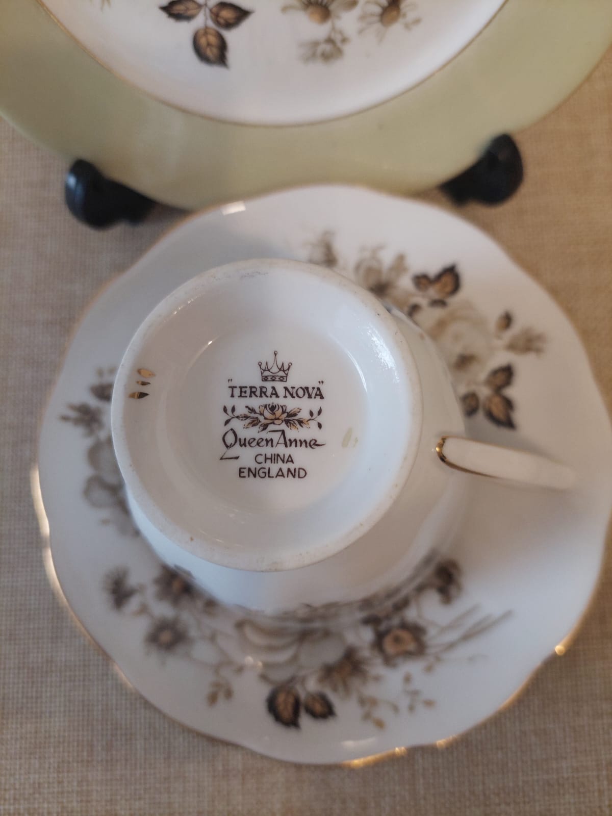 Trío de porcelana Queen Anne compuesto por taza, plato de té y plato de pan/postre, decorados con un motivo floral en tonos beige, crema y marrones suaves con filo dorado. Queen Anne es una marca inglesa de vajilla clásica del siglo XX, apreciada por sus formas elegantes y patrones discretos, muy presente en la tradición de mesa vintage británica y pensada para quienes valoraban la distinción en el uso diario sin recargar la mesa. Un trío sobrio y atemporal que combina con casi cualquier estilo. Pieza única en Nova Vita, una vez que sale de la tienda no se repite.
