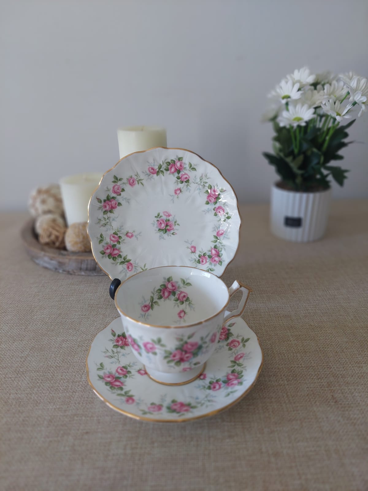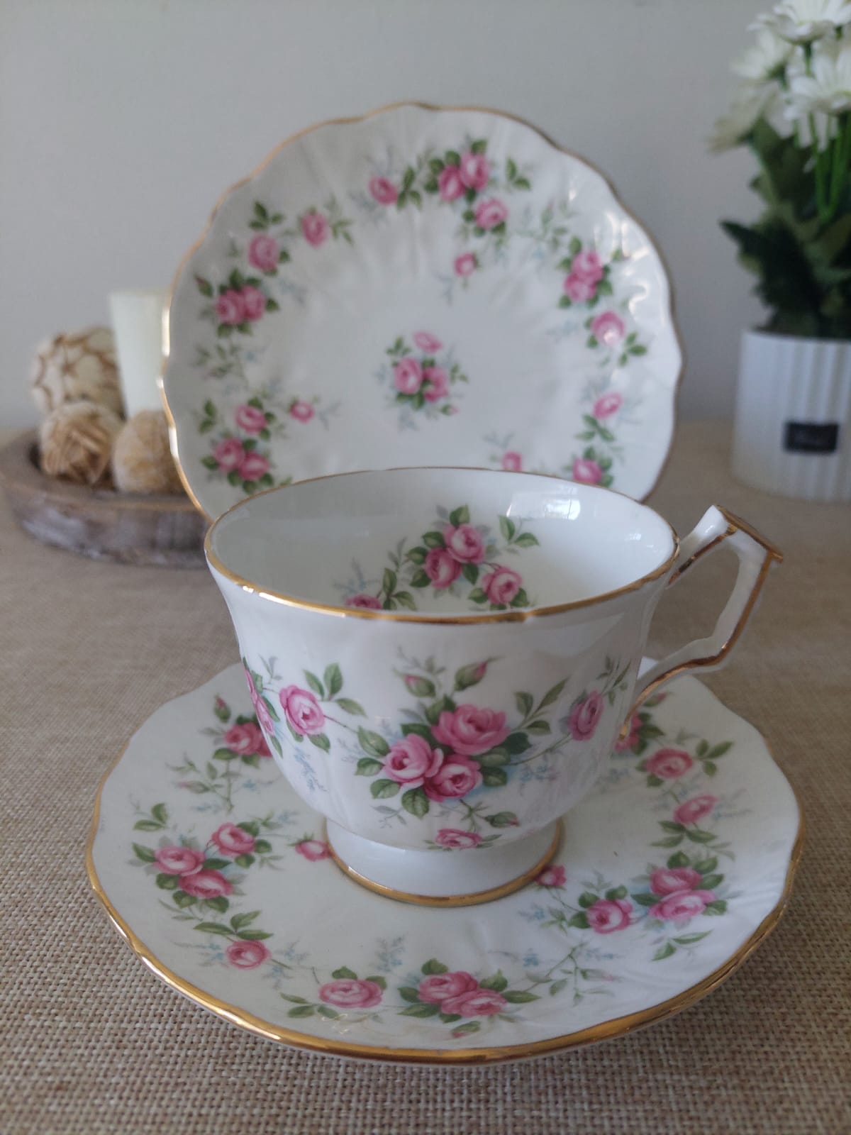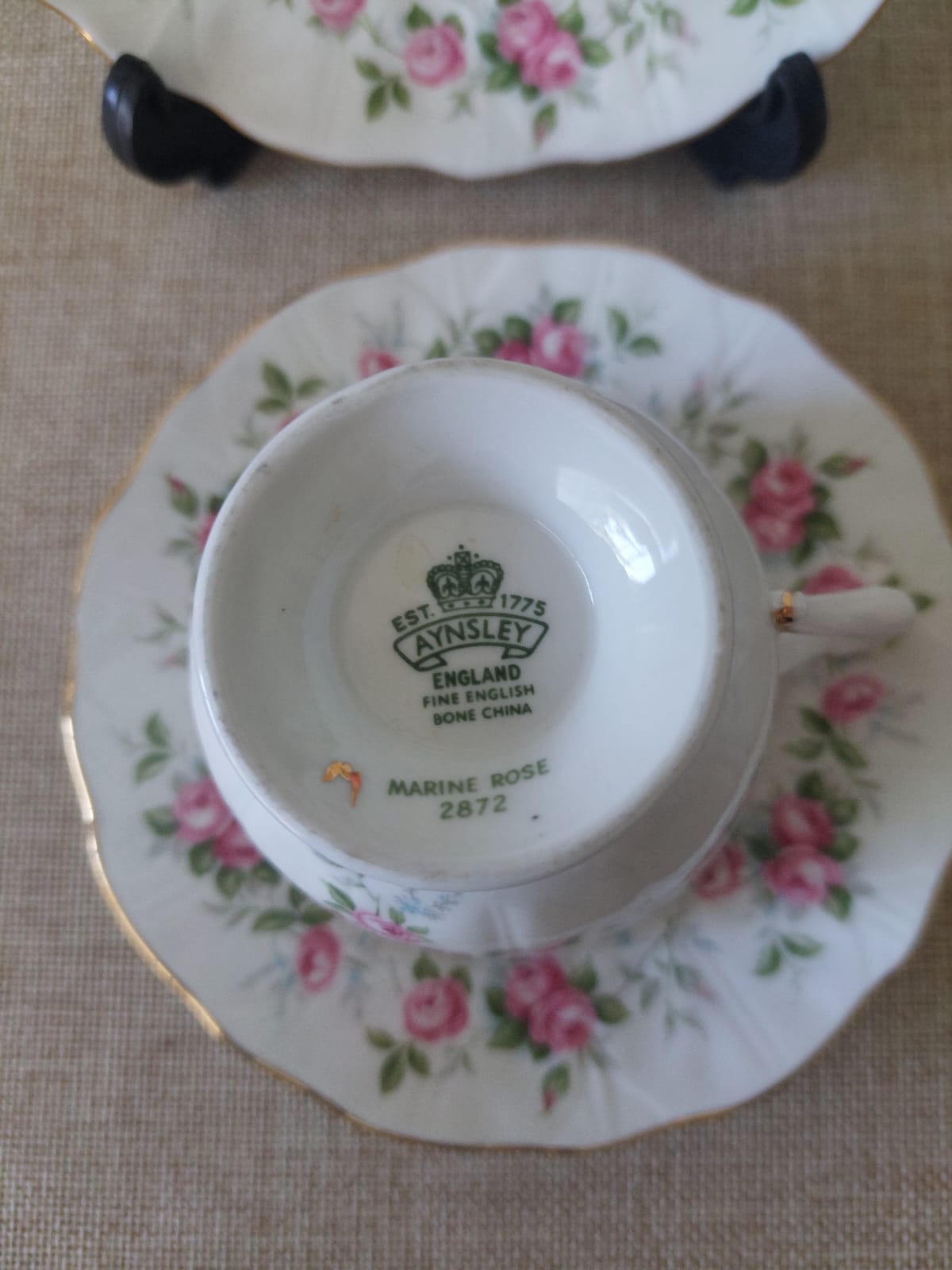 Trío de porcelana fina Aynsley en blanco con rosas rosas y filo dorado, en estado impecable sin detalles.
