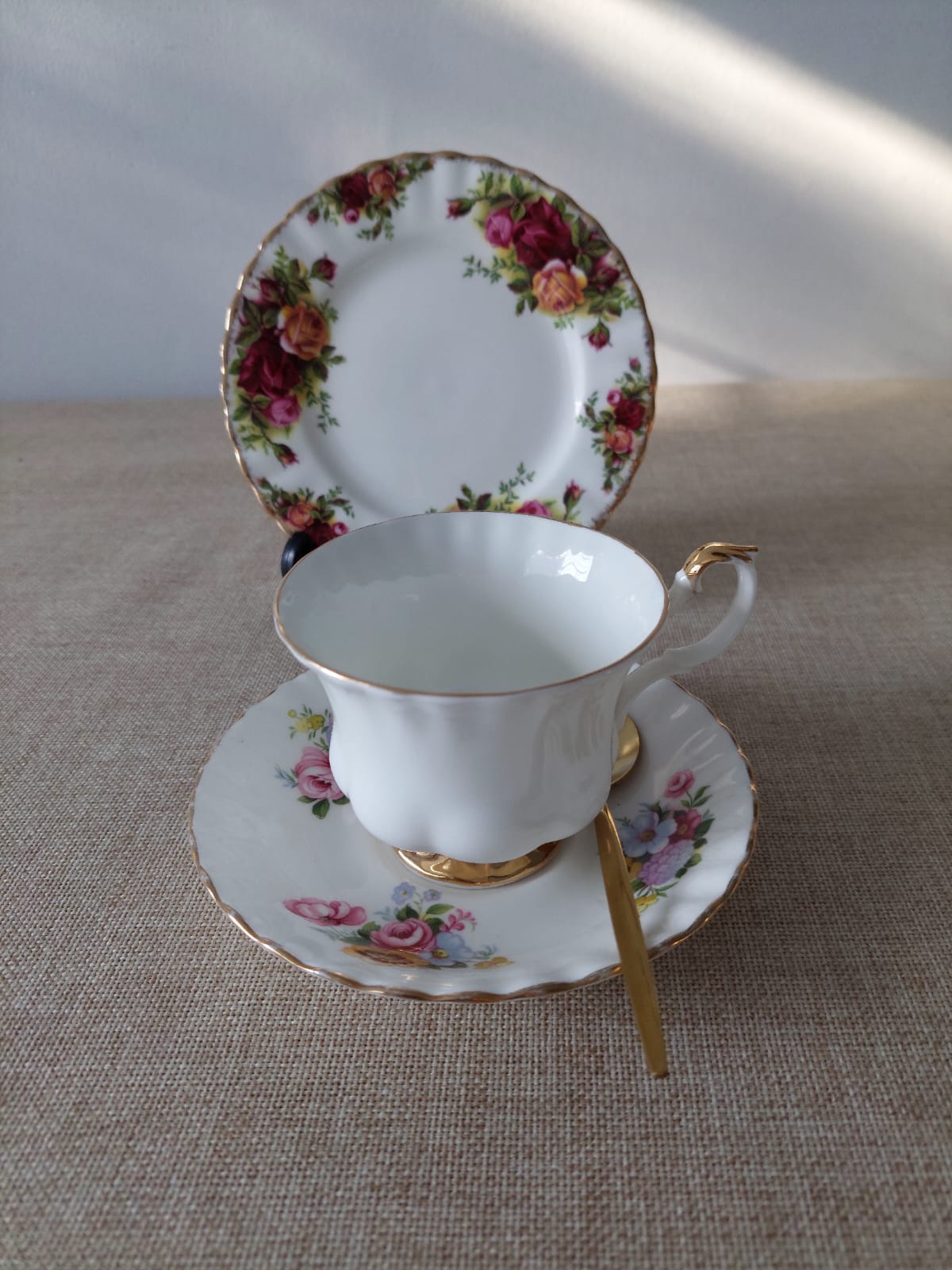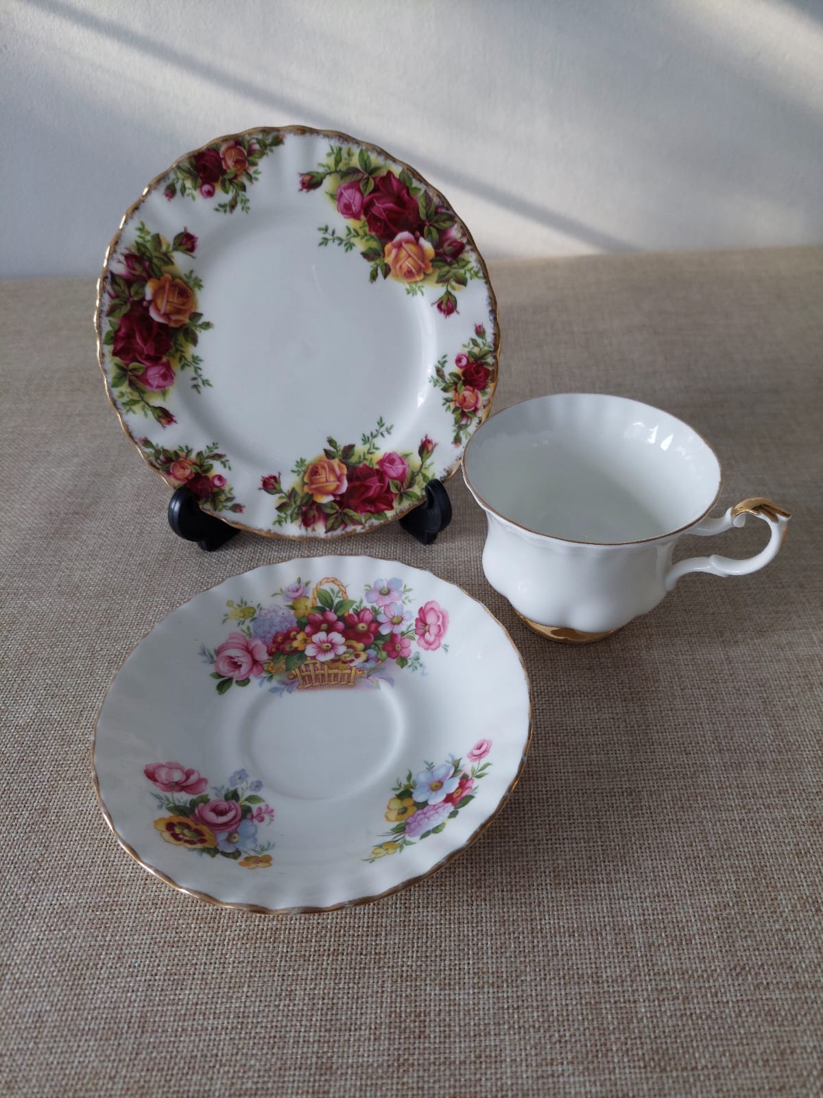 Exquisito trio de té Royal Albert de la serie Summertime, en bone china fabricada en Inglaterra. Incluye taza, platillo con canasta de flores multicolor y plato de torta con guirnalda de rosas rojas y amarillas. Borde ondulado con filete dorado en todas las piezas. Estado nuevo, sin uso. Un clásico británico para una mesa de ensueño.