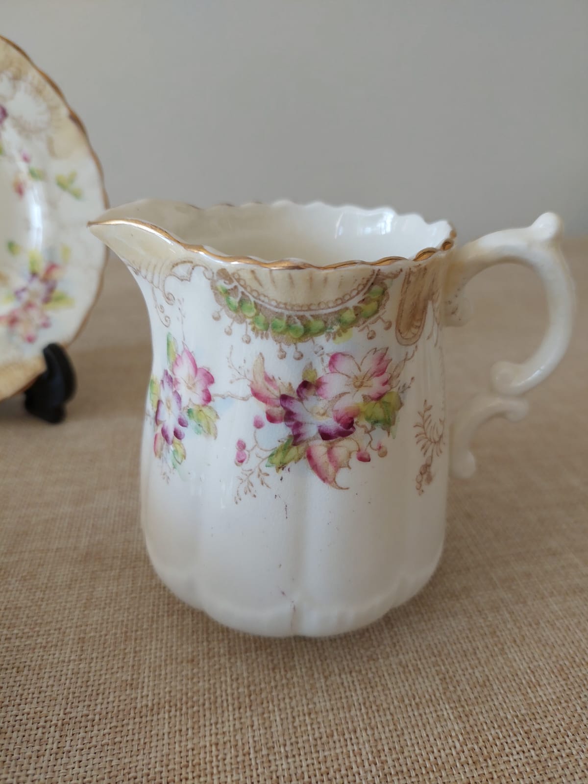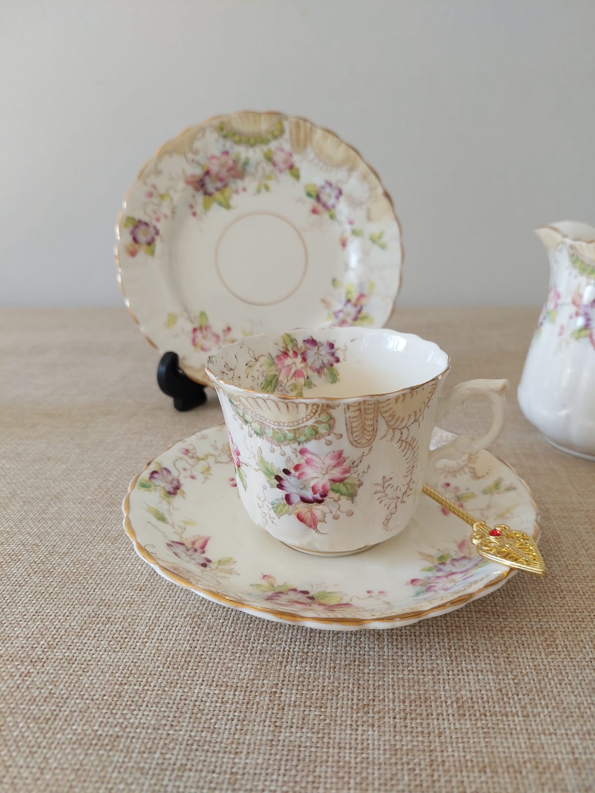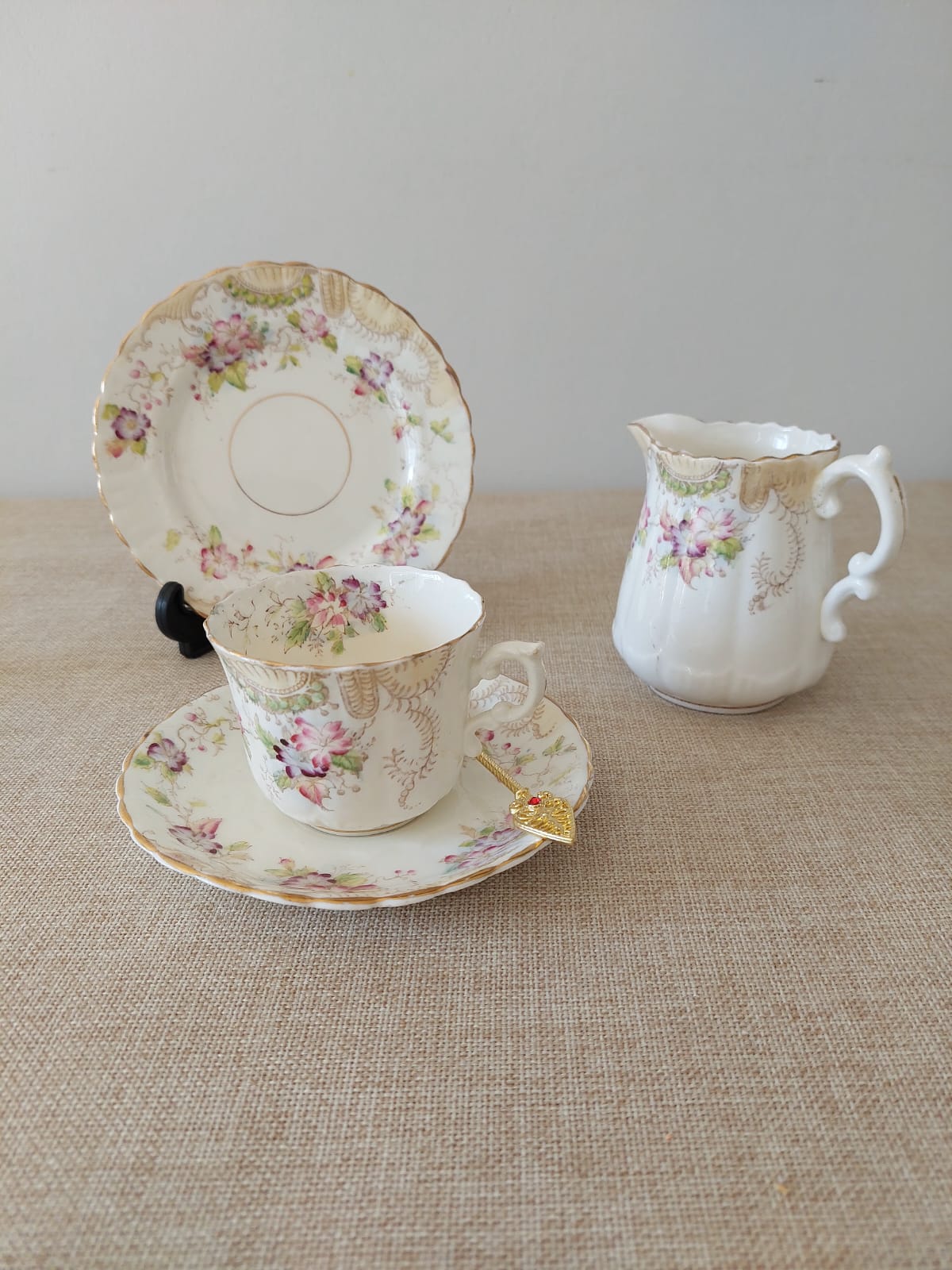 Encantador trío en porcelana vintage: taza, platillo y lechero. Fondo crema marfil con motivos florales en rosas y malvas, hojas verdes, arabescos dorados y bordes ondulados con filete dorado. Una pieza de época con mucho carácter. Presenta una pequeña mancha en la taza, detalle propio de su historia y uso anterior.